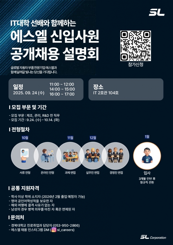 제 목 | [에스엘]IT대학 선배와 함께하는 신입사원 공개채용 설명회: 9.24(수) 11시,2시,4시, IT2-104 | ||||
