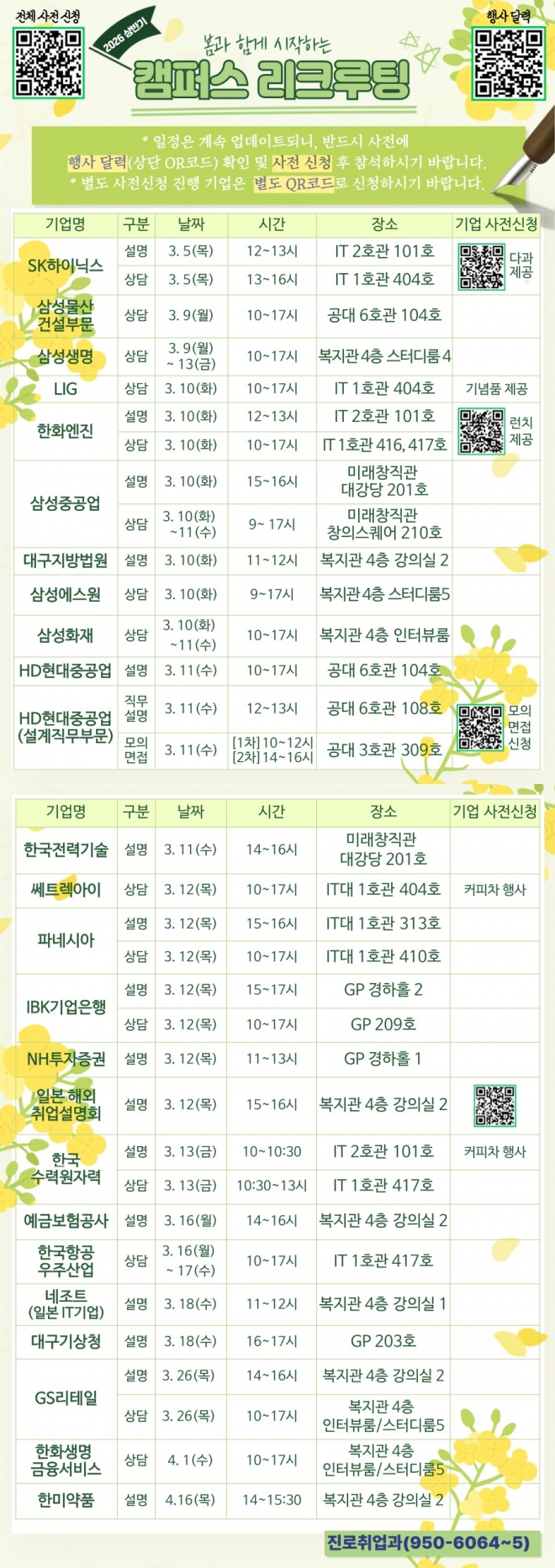 | 제 목 | (수정)2026 상반기 캠퍼스 리크루팅 일정표(SK하이닉스,한화엔진,LIG,삼성중공업,현대중공업,한수원 등) | ||||