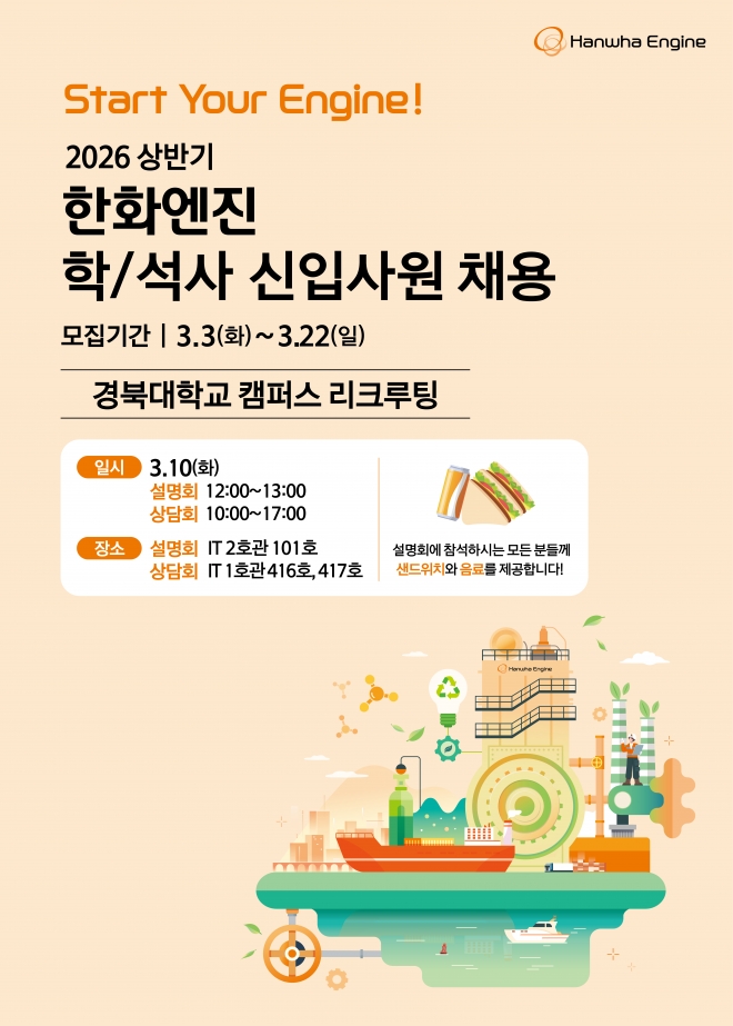 | Start Your Engine! 한화엔진이 경북대 여러분을 찾아갑니다. 학생분들의 많은 참여 부탁드립니다 :)