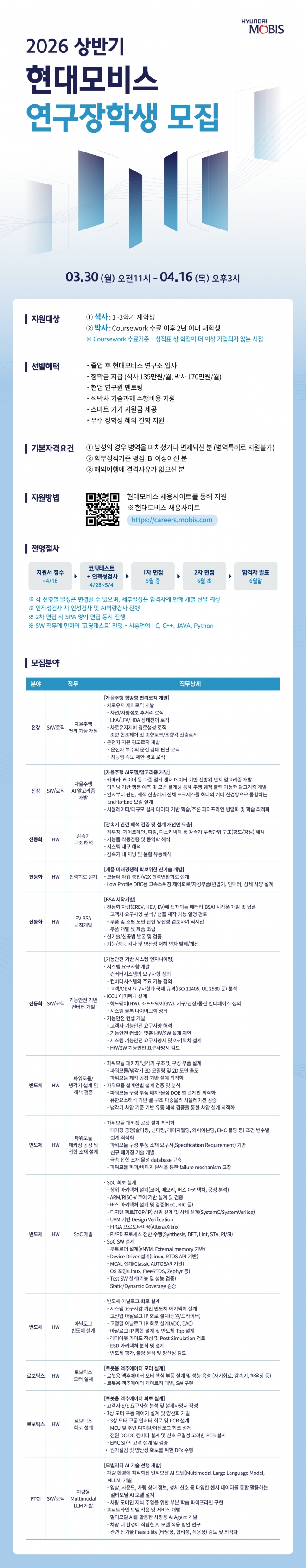 | 현대모비스에서 26년 상반기 연구장학생을 선발하고 있습니다. 현대모비스와 함께 모빌리티의 미래를 두 손으로 직접 열어갈 석/박사 인재 여러분의 많은 관심과 지원 바랍니다.
