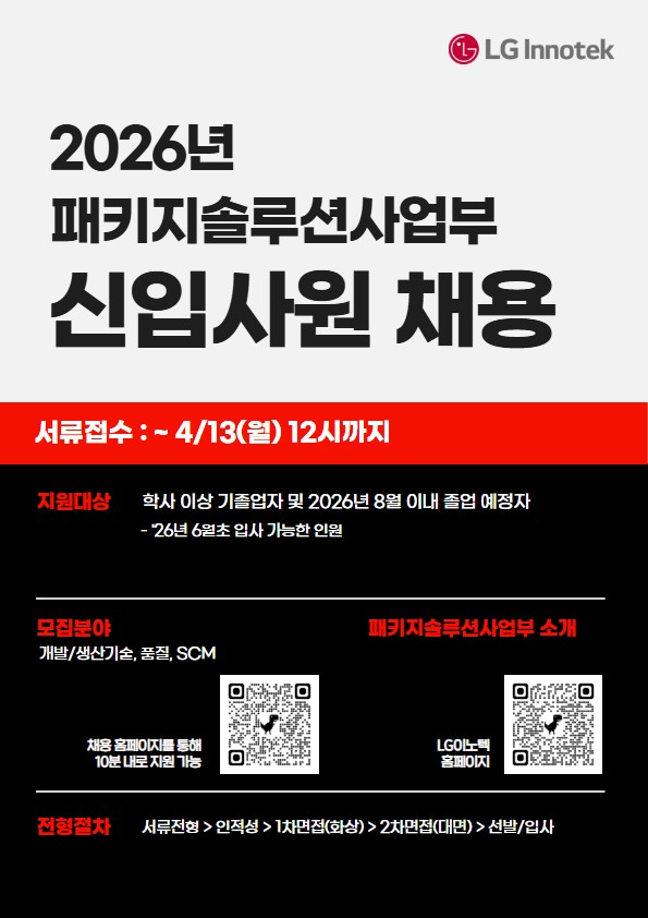 | 제 목 | [LG이노텍] 2026년 패키지솔루션 신입사원 채용(~4/13(월) 12시까지) | ||||||||||||
