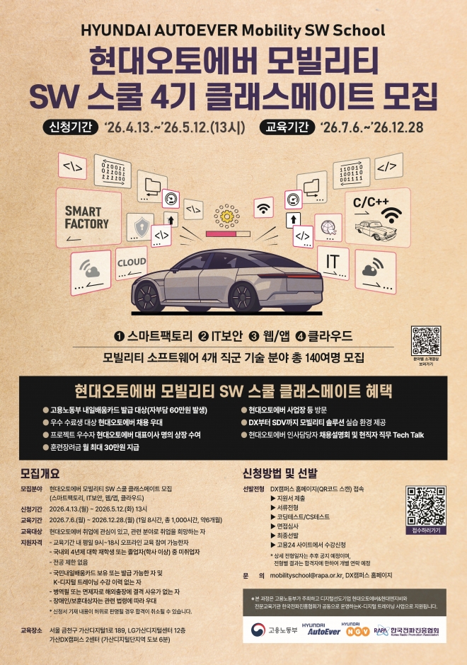 | 제 목 | [현대오토에버] 모빌리티 SW스쿨 4기 클래스메이트 모집 (~ 5/12) | ||||
