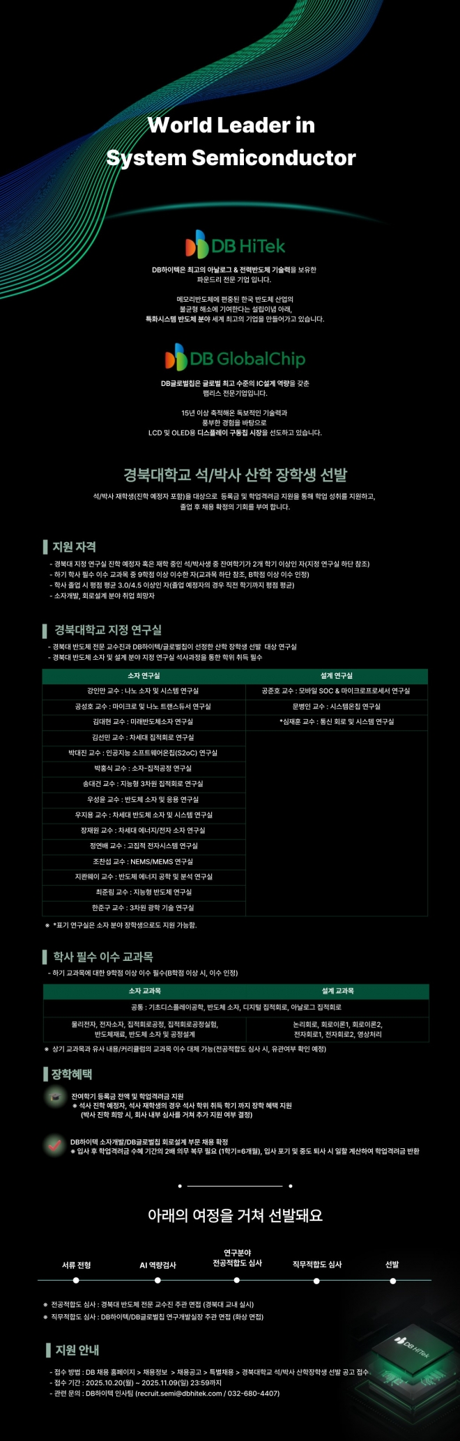 | # 관련 문의 : ☎ 950-6607 1.지원자격 - 지정연구실 진학 예정자 혹은 석/박사생 중 잔여학기가 2개 학기 이상인 자 *학부생: 2026년 2월 졸업예정자로 졸업 후 지정연구실 진학예정인 학생만 지원 가능 - 학사 필수 이수 교과목 중 9과목 이상 이수한 자(B학점이상 이수 인정) - 학사 졸업시 평점 평균 3.0/4.5 이상인 자(졸업예정자인 경우, 직전학기 평점 평균) - 소자개발, 회로설계 분야 취업희망자 2. 장학생 모집 일정