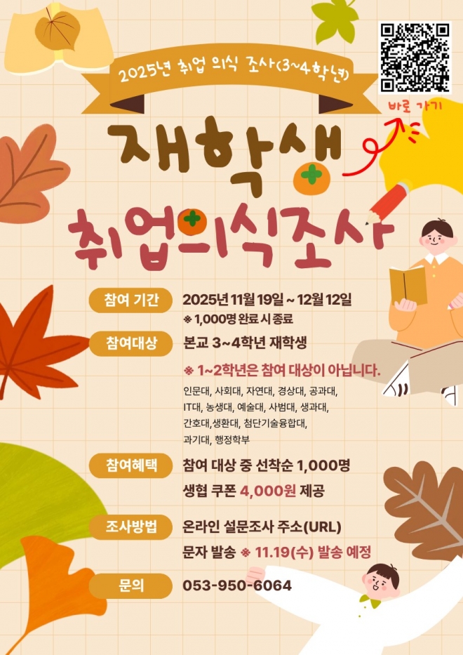 | 가. 조사명: 2025년 재학생 취업의식조사 나. 조사대상: 본교 재학생 3, 4학년 중 1,000명 정도 (※의대, 약대, 치대, 수의대 제외) 다. 조사실시: 2025. 11. 19.(수) ~ 12. 12.(금) 라. 조사내용: 붙임 설문문항 참조 마. 조사방법: 온라인 설문조사(URL 주소 https://surveyl.ink/Kyungpook_Univ_01 )
