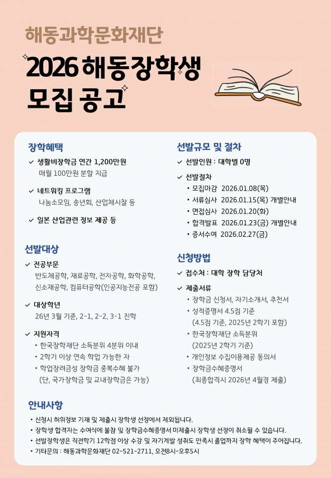 | 제 목 | [생활비 1,200만원]2026 해동과학문화재단 장학생 추천: 1.2(금) 11:00까지 | ||||