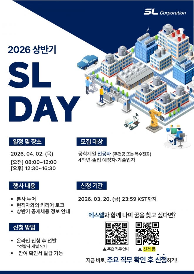 [신청 링크] https://smore.im/form/ATz2KKZWWH [주요 직무 안내 링크] https://hyper-cobweb-d40.notion.site/SL-DAY-31e4ec3a0993809d8ccbc90231e996e2?source=copy_link ※ 설문 내 희망 직무 선택 항목이 있으므로 직무 안내 확인은 필수입니다. [참고용 회사 관련 링크] 기업 사이트 | | SL corporation 채용 사이트 | 에스엘 채용 | 채용사이트 채용 인스타그램 | 에스엘 채용 | SL Careers(@sl_careers) • Instagram 사진 및 동영상