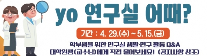 대학원 진학을 고민 중인 학생들을 위해 대학원생(교수님)이 직접 연구실을 소개하는 오픈랩 주간을 운영합니다. 연구 환경을 미리 경험해 볼 수 있는 좋은 기회이오니 많은 참여 부탁드립니다. 1. 기간 : 2026. 4. 29.(수) ~ 5. 15.(금) - 대학원생(교수님)이 이야기하는 우리 연구실 생활 - 학부생이 궁금해 하는 연구실 안내 및 질의 응답 - 연구실 방문 후 대학원생 등과의 식사 2. 참여 연구실 ※ 연구실 방문 전 아래 연구실 연락처로 연락 후 일정을 확인하여 방문해 주십시오. ( 가능한 4. 29.(수) 전에 연구실로 연락해서 일정 조율, 이후 연락도 가능함 ) ※ 아래 연구실 외에도 학부 교수님 또는 연구실로 미리 연락 후 연구실을 방문해서 궁금한 점을 문의해도 되니, 많은 관심과 참여 바랍니다. 연번 | 참여 교수 | 학부생 방문호실 | 연락처 | 비고 | 1 | 김민영 | IT1-510 | 053-940-8671 / gsu04295@nate.com | | 2 | 김선민 | IT1-806 | 950-5531 / sunmean@knu.ac.kr | | 3 | 김수배 | 공대8호관-407 | 950-7218 / soobae.kim@knu.ac.kr | | 4 | 김진규 | IT1-403 | 950-7226 / tmddhkstj@knu.ac.kr | | 5 | 김학린 | IT3-303 | 053-950-8622 / kms0493@knu.ac.kr | | 6 | 김환진 | IT1-702 | 950-5524/ hwanjin@knu.ac.kr | | 7 | 나현수 | IT3-304 | 950-5512 / hsra@knu.ac.kr | | 8 | 도윤선 | IT1-824 | 950-7831 / yuns.do@knu.ac.kr | | 9 | 박세훈 | IT1-812 | 950-5521/sehoon.park@knu.ac.kr | | 10 | 박순용 | IT1-415 | 940-8691 /kevin27600@knu.ac.kr | | 11 | 박찬은 | IT1-305 | 950-5518 / chaneun@knu.ac.kr | | 12 | 신효근 | IT1-717 | hyogeunshin@knu.ac.kr | | 13 | 우성윤 | IT3-314 | 950-5533 / wlt17@naver.com | | 14 | 유지만 | 공대7호관-307 | 950-5537 / jiman.yu@knu.ac.kr | | 15 | 이상문 | IT1-622 | 940-8809 / cpsc.sohyeon@gmail.com | | 16 | 이석진 | IT1-520 | 940-8642 / in91018@knu.ac.kr | | 17 | 이성학 | IT1-307 | 950-7216 / shak2@ee.knu.ac.kr | | 18 | 이현열 | 1호관 603호 | 950-5536 hyunyeollee@knu.ac.kr | | 19 | 장병철 | IT3-302 | 940-8832 / leehyeontae9@knu.ac.kr | | 20 | 전만식 | IT1-521 | 950-7846 / msjeon@knu.ac.kr | | 21 | 지콴웨이 아우구스투스 | IT3-301A | 053-950-5528 /semiconductorknu@gmail.com | | 22 | 한동석 | IT1-509 | 053-940-8669 / kangdg@knu.ac.kr | | 23 | 한세경 | 공대8호관 404호 | 950-7230 / skhan@knu.ac.kr | |