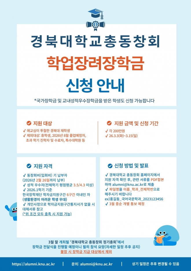 2026.1학기 경북대학교총동창회 학업장려금 장학생 선발 안내(∼3.15/일)