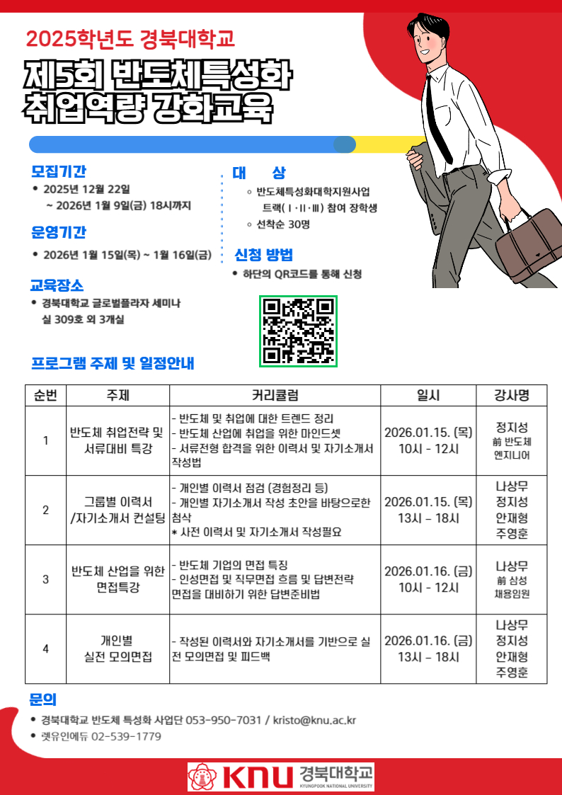 前 삼성채용임원 및 반도체 엔지니어, 취업전문가와 함께하는 취업역량 강화교육(캠프)에 초대합니다. 이공계 전문 교육기관에서 수많은 취업준비생의 자기소개서와 면접을 검토하고 합격시킨 노하우를 경북대학교 반도체특성화대학 사업단 학생들에게 공유하고, 맞춤 이력서/자기소개서 컨설팅과 실전 모의면접까지 체계적으로 준비할 수 있습니다.