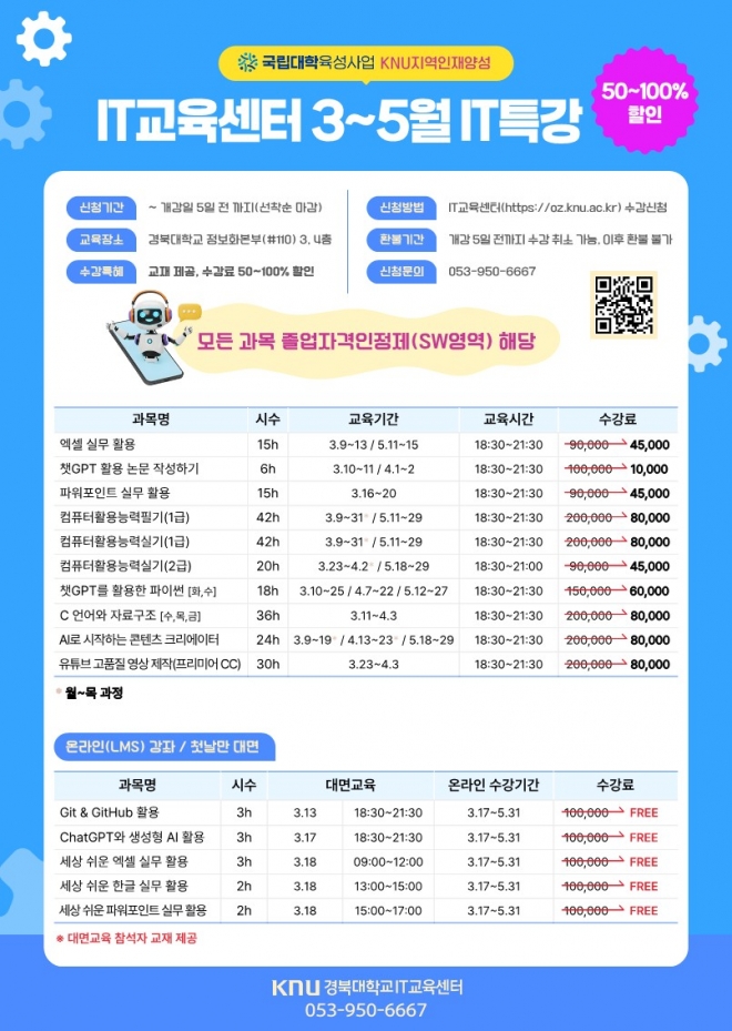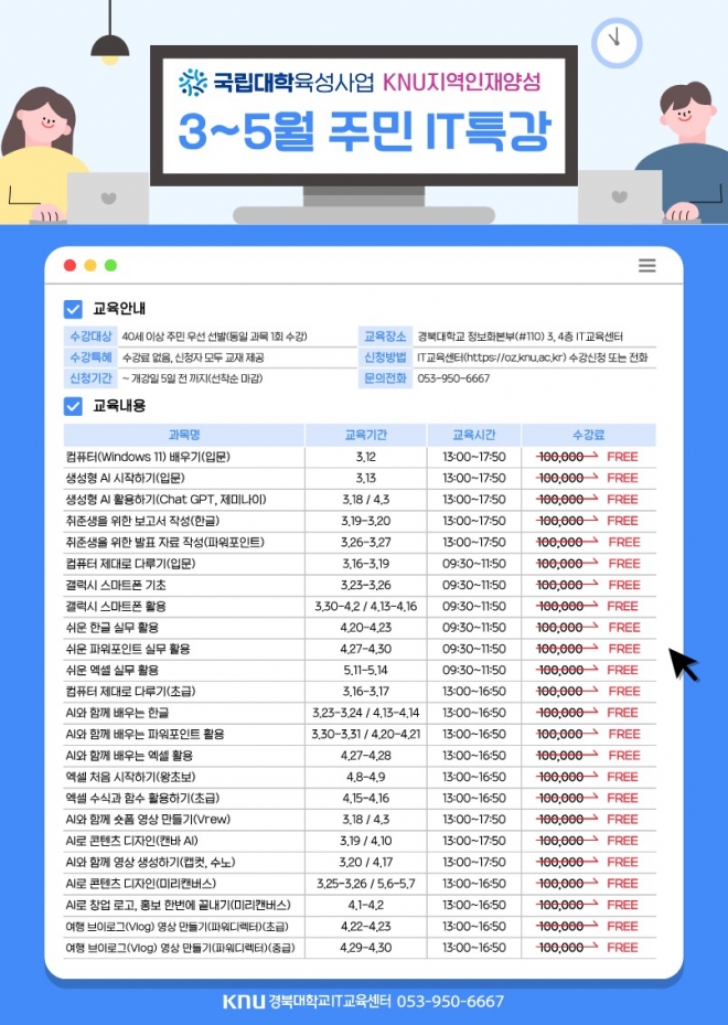 마. 교육장소 및 문의처: 대구캠퍼스 정보화본부 3층 IT교육센터 ☎ 053-950-6667