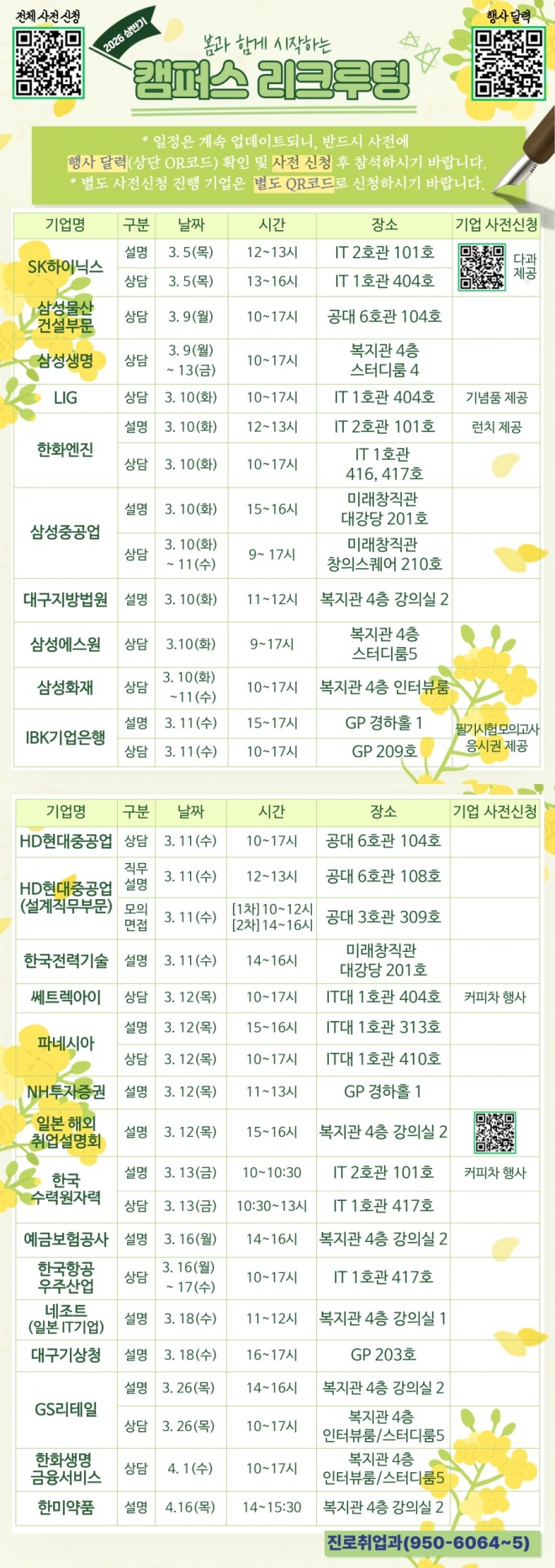 2026 상반기 캠퍼스 리크루팅 일정표(SK하이닉스,한화엔진,LIG,삼성중공업,현대중공업,한수원 등)