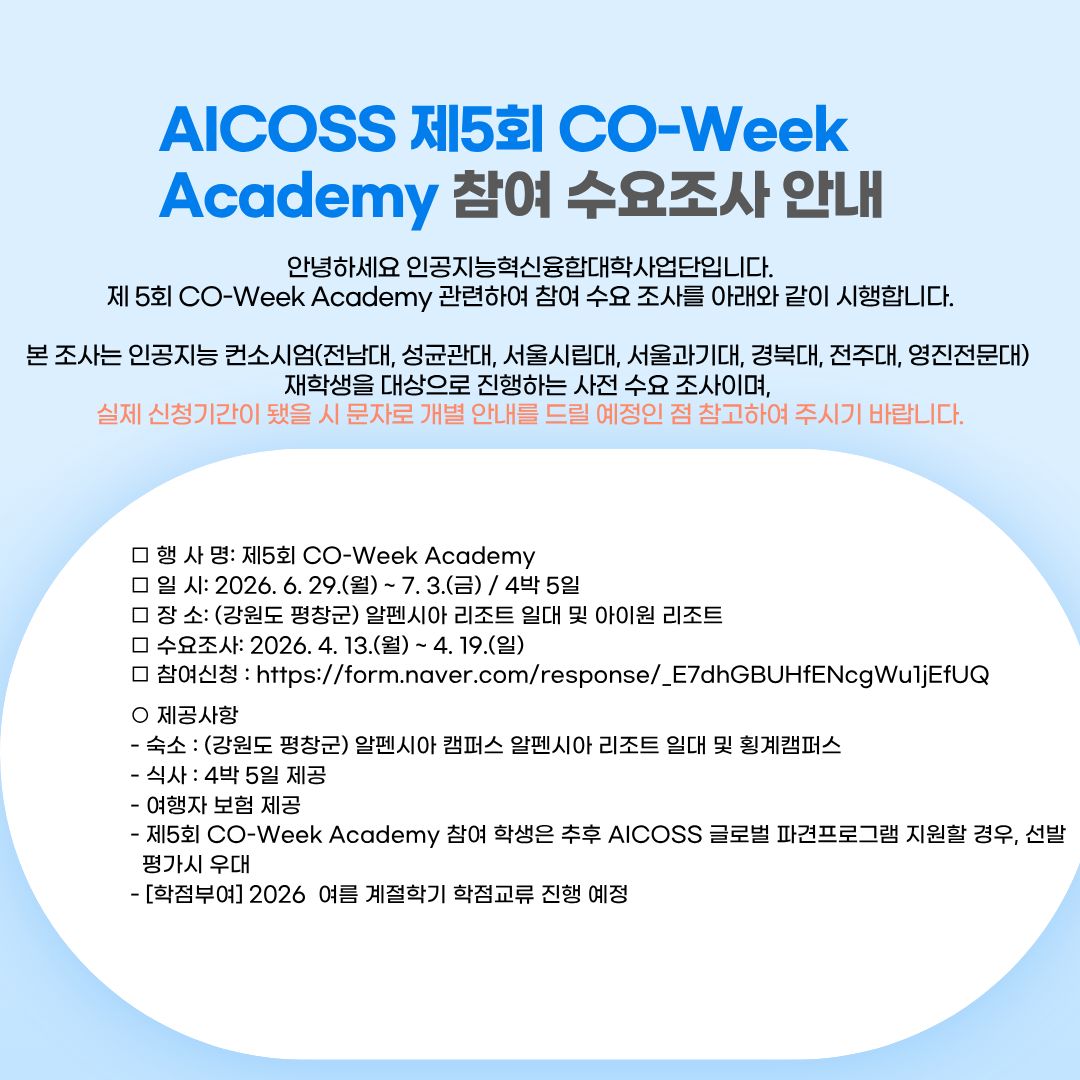 경북대학교 인공지능혁신융합대학사업단에서 제5회 CO-WEEK Academy를 다음과 같이 운영하고 참가자 사전 수요조사를 실시하오니 많은 참여 바랍니다.